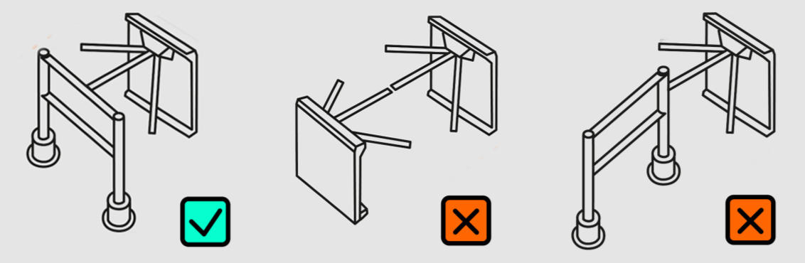 При монтаже рекомендуется: устанавливать стойку турникета на прочные и ровные бетонные (не ниже марки 400), каменные и Т.П. основания, имеющие толщину не менее 150 мм; выровнять основание так, чтобы точки крепления стойки турникета лежали в одной горизонтальной плоскости (контролировать с помощью уровня); применять закладные фундаментные элементы (300*300*300 мм) при установке стойки турникета на менее прочное основание (возможно применение рамного основания); производить разметку установочных отверстий в соответствии со схемой; при монтаже контролировать вертикальность положения стойки с помощью отвеса; организовать дополнительный аварийный выход: при организации зоны прохода через турникет следует учитывать, что механизм доворота работает по следующему принципу: