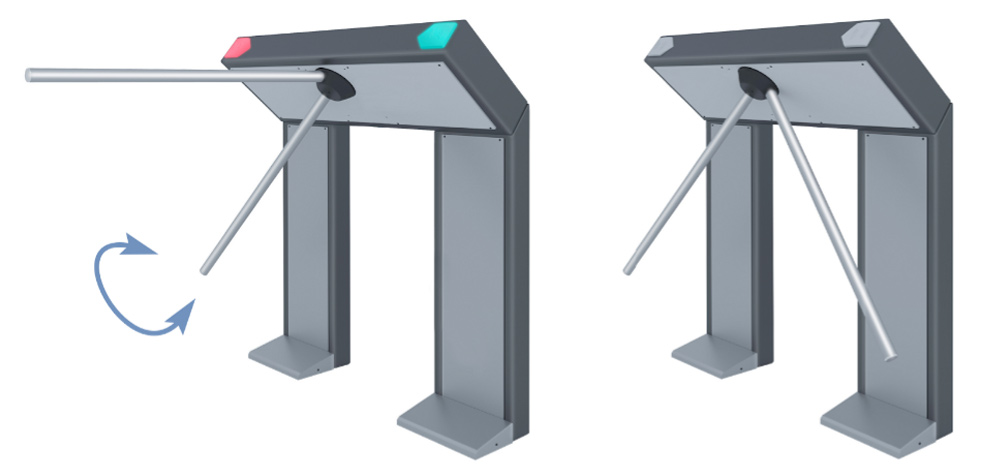 • Полноценный нормально-открытый принцип работы турникета в комплексе с планками-антипаника повышает уровень готовности к режиму эвакуации при любых типах ЧС. При отсутствии питания турникет переходит в режим антипаники, т.е. фланец с планками проворачивается, опуская планки вниз и освобождая проход.