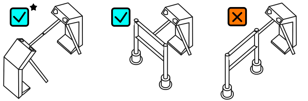 При монтаже рекомендуется: устанавливать стойку турникета на прочные и ровные бетонные (не ниже марки 400), каменные и Т.П. основания, имеющие толщину не менее 150 мм; выровнять основание так, чтобы точки крепления стойки турникета лежали в одной горизонтальной плоскости (контролировать с помощью уровня); применять закладные фундаментные элементы (300*300*300 мм) при установке стойки турникета на менее прочное основание (возможно применение рамного основания); производить разметку установочных отверстий в соответствии со схемой; при монтаже контролировать вертикальность положения стойки с помощью отвеса; организовать дополнительный аварийный выход: при организации зоны прохода через турникет следует учитывать, что механизм доворота работает по следующему принципу: