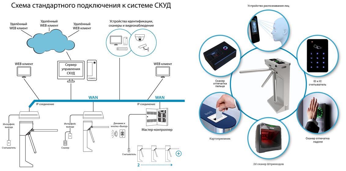 Это устройство может быть оснащено устройством распознавания лица, идентификаторами личности по отпечатку пальца или ладони, картоприемником, устройством контроля рабочего времени и т.д. Вдобавок к этому, вы можете интегрировать стороннее оборудование через сухие контакты: компьютер или металлодетектор. Это позволяет осуществлять одновременный контроль над пропускной системой оборудования для более надежной безопасности охраняемого объекта.