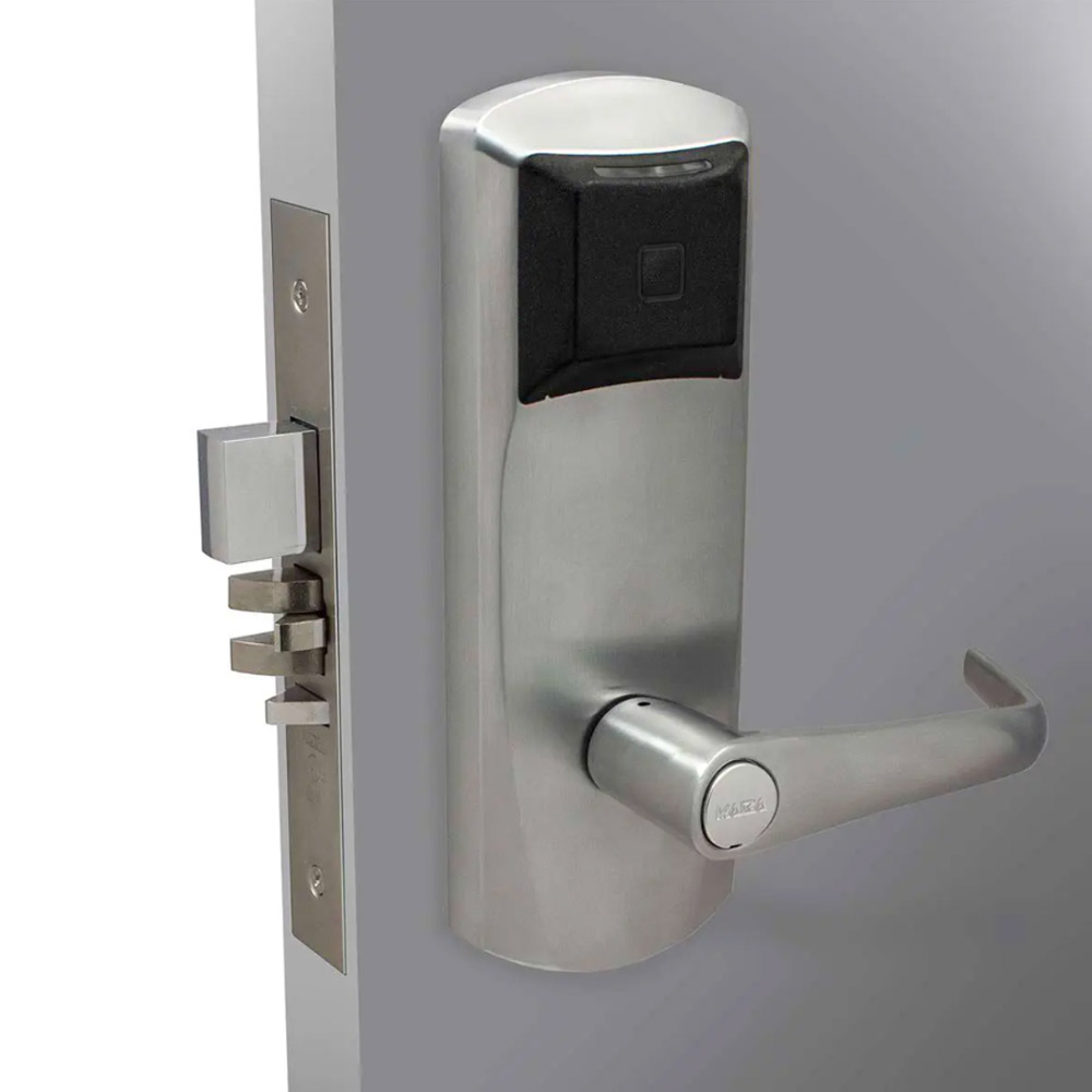 Замок Saflok RT Plus ESM RT Plus ESM без лицевой планки, ручка Short, с электронным способом аварийного открытия,возможность смены сторонности, без BLE, матовый хром.