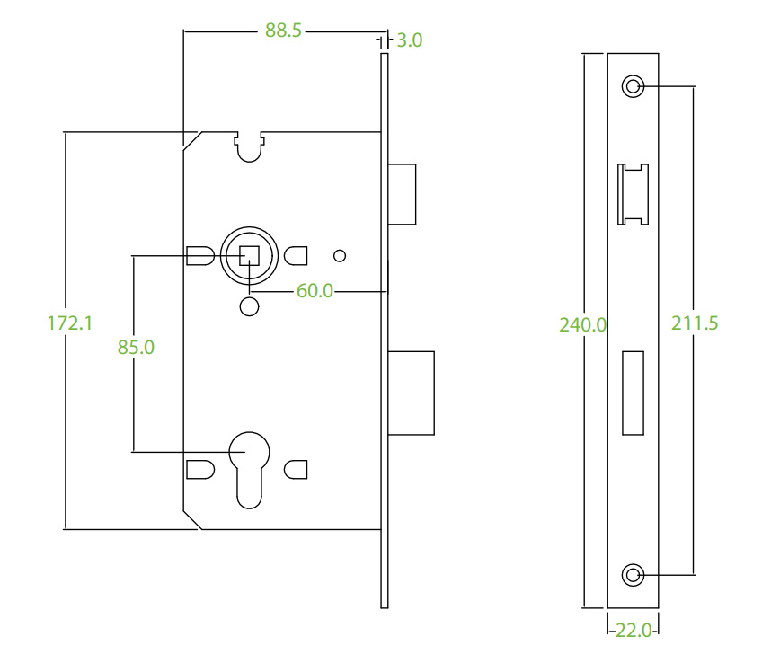 • Корпус врезного замка европейского стандарта (стандарт ЕС 6085, опционально 3085)